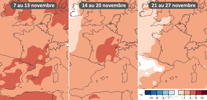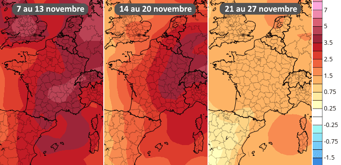 Si aucune offensive majeur du froid n'est à l'horizon, la baisse des températures sera inexorable dans les prochaines semaines. Avec l'avancée dans la saison, la durée du jour est de plus en plus réduite et les masses d'air doux sont de moins en moins massives. Ainsi, la plupart des régions françaises perdent en moyenne 4°C entre le commencement et la fin du mois de novembre. À Lyon ou Paris, la normale des températures diurnes passe de 13°C au début du mois à 9°C à la fin de celui-ci.