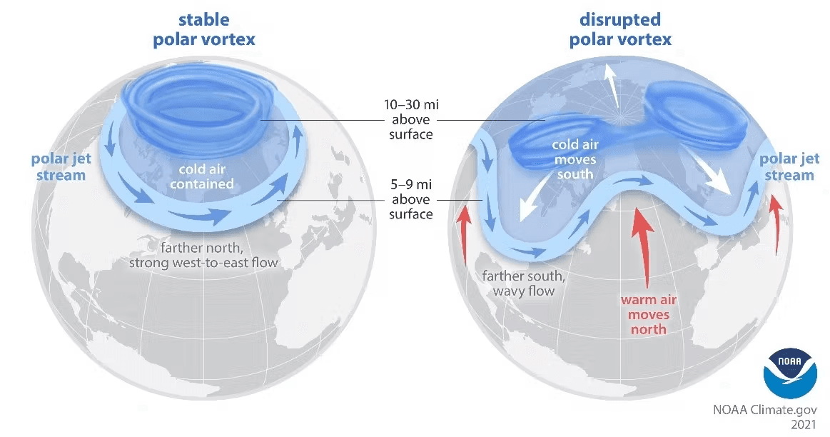Schéma montrant le vortex polaire concentré (à gauche) ou instable (à droite) – via NOAA