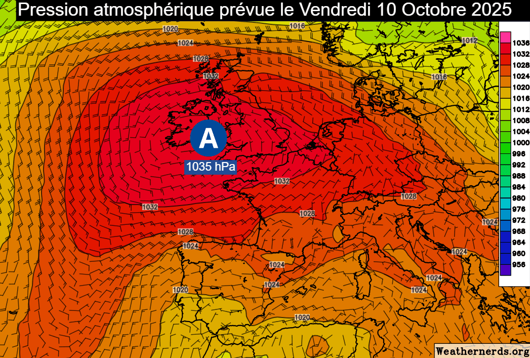 Vous l'aurez peut-être constaté en regardant votre baromètre : les pressions sont de plus en plus hautes ! Un blocage anticyclonique s'est mis en place et continue de se renforcer. Ce vendredi 10 octobre 2025, les pressions dépasseront les 1035 hPa entre l'Irlande et le Pays de Galles et les 1030 hPa sur toutes les régions du nord de la France. On parle de blocage car cet anticyclone va très peu bouger au cours des 7 prochains jours, restant centré sur les Îles Britanniques et continuant de protéger la France.