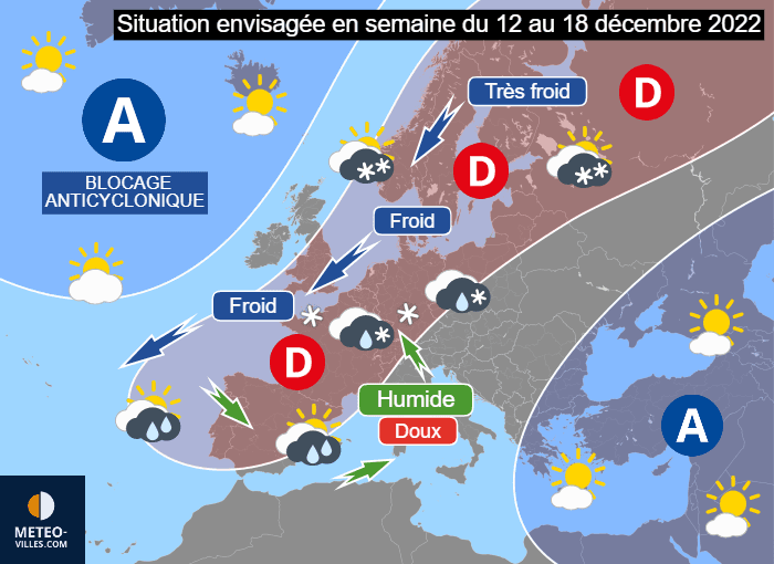 Certains scénarios s'orientent vers un conflit de masses d'air au sein d'un contexte dépressionnaire au cours de la semaine du 12 au 18 décembre 2022. L'anticyclone camperait sur le nord de l'Atlantique et le Groenland tandis que des dépressions pourraient transiter des Açores vers la Scandinavie en passant par la France. Celles-ci seraient susceptibles de faire remonter de l'air doux au sud tandis qu'elles aspireraient l'air froid au nord. Une telle situation serait propice au passage de perturbations pluvio-neigeuses le long de la zone de contact entre air froid et air doux.
