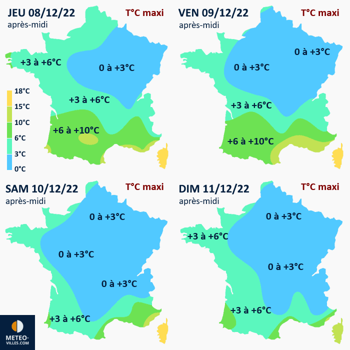 Prévisions des températures maximales du jeudi 8 au dimanche 11 décembre 2022 - Météo Villes