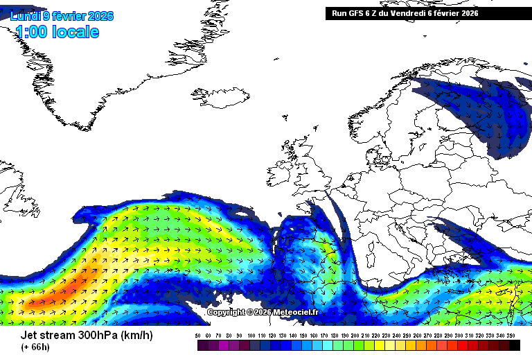 Animation du courant jet entre l'Atlantique et l'Europe du 8 au 14 février 2026 – Modèle GFS via meteociel.fr