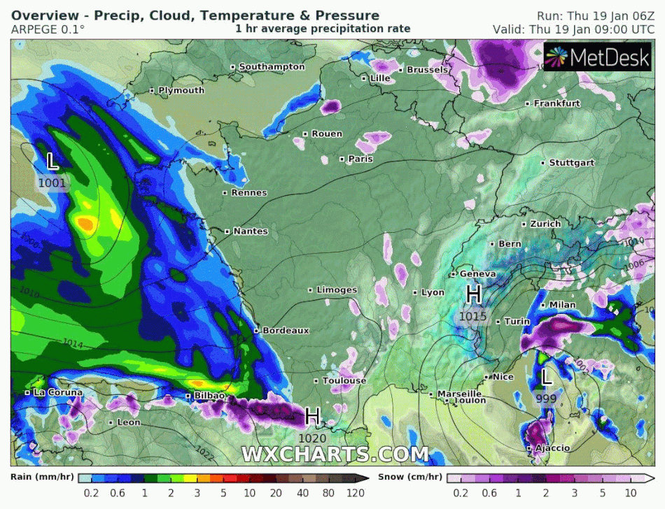 Ce jeudi 19 janvier 2023, une nouvelle dépression se creuse sur le proche-Atlantique, se décalant rapidement du sud de la Bretagne vers le golfe de Gascogne puis jusqu'au bassin méditerranéen. Elle est associée à un nouveau front pluvieux, notamment actif en cours d'après-midi et de soirée. Au nord de la dépression, l'air froid devrait suffisamment se rabattre pour autoriser des précipitations sous forme de neige, particulièrement dans le sud-ouest en fin de journée. Ci-dessous, le modèle ARPEGE identifie un risque marqué entre la Dordogne et l'intérieur du Roussillon.