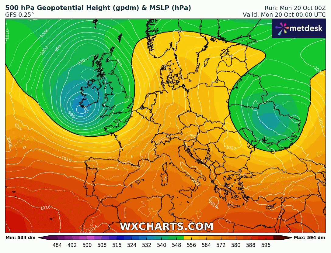 Animation des géopotentiels sur l'Europe du 20 au 26 octobre 2025 – Modèle GFS via WX CHARTS