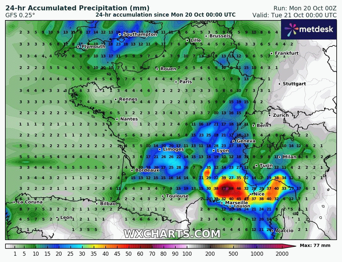 Animation des cumuls de précipitations sur la France du 20 au 26 octobre 2025 – Modèle GFS via WX CHARTS