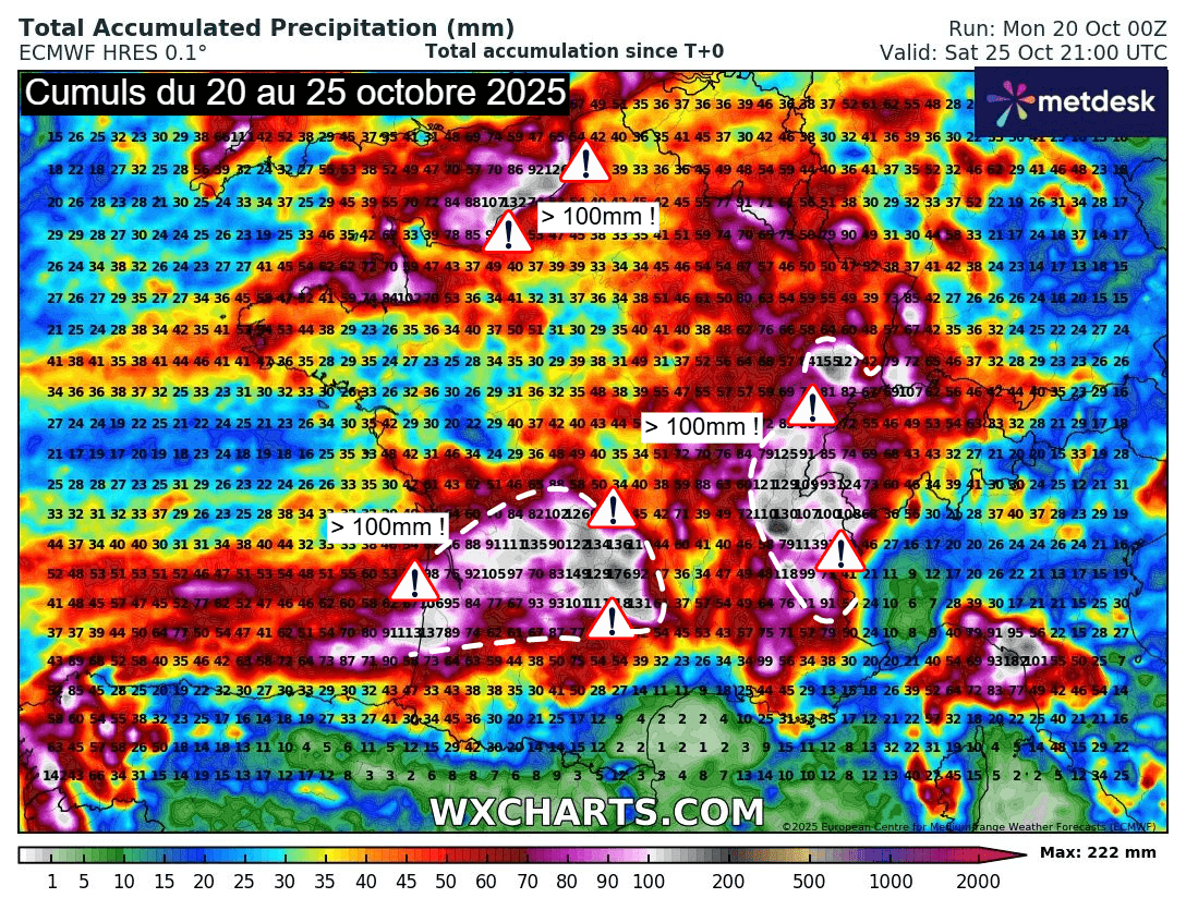 Cumuls de précipitations sur la France jusqu'au samedi 25 octobre 2025 – Modèle ECMWF-HRES via WX CHARTS
