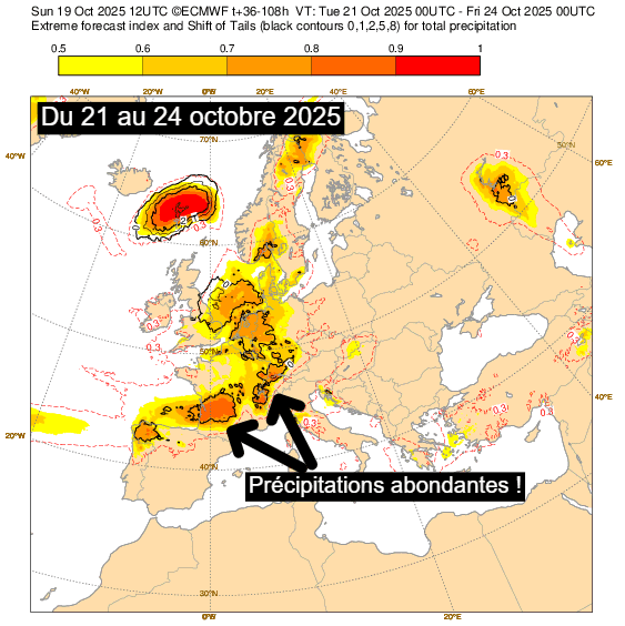 Extreme Forecast Index pour la période du 21 au 24 octobre 2025 – ECMWF