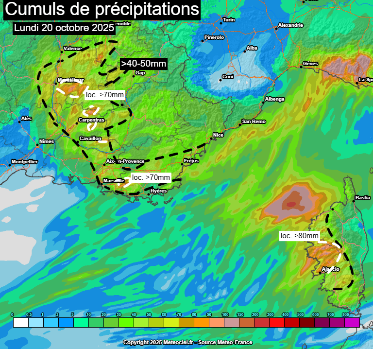 Ce lundi déjà, les précipitations se montrent parfois fortes sur le sud-est du pays avec des pluies parfois fortes et orageuses persistant jusqu'en fin de journée, pouvant donner des cumuls notables entre les abords de la vallée du Rhône, la Côte d'Azur et l'ouest de la Corse.