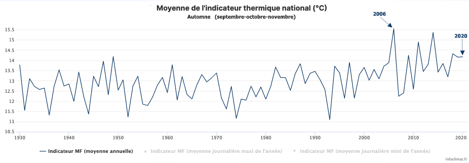 Les mois sous les moyennes de saison deviennent bien rares ces derniers temps. Mais au niveau des saisons, il devient désormais quasi-impossible de passer dans le bleu. Cet automne 2020 l’a encore prouvé : avec une anomalie nationale de +1.0°C (température moyenne de 14.17°C), cet automne se classe au 6e rang des plus chauds depuis le début des relevés, ex-æquo avec l’automne 1949 mais aussi 2019.
