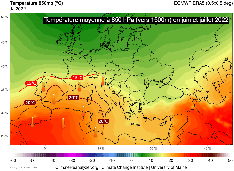 En cet été 2022, la France a presque constamment baigné dans les masses d'air très chaud. Pour simplifier, si la masse d'air atteint 15°C à 850 hPa (vers 1500m d'altitude), une vague de chaleur peut s'observer au sol avec des températures susceptibles d'atteindre les 35°C. Lorsque les 20°C sont atteints à 850 hPa, ce sont généralement des températures caniculaires que l'on retrouve nuit & jour. Sur l'ensemble des mois de juin et juillet 2022, on constate que la température moyenne à 850 hPa a dépassé les 15°C sur le tiers sud de la France, alors que ce seuil est normalement réservé à la partie sud de l'Espagne ! De même, l'isotherme des 20°C à 850 hPa s'est positionné sur le centre de l'Espagne au lieu du nord du Maghreb !