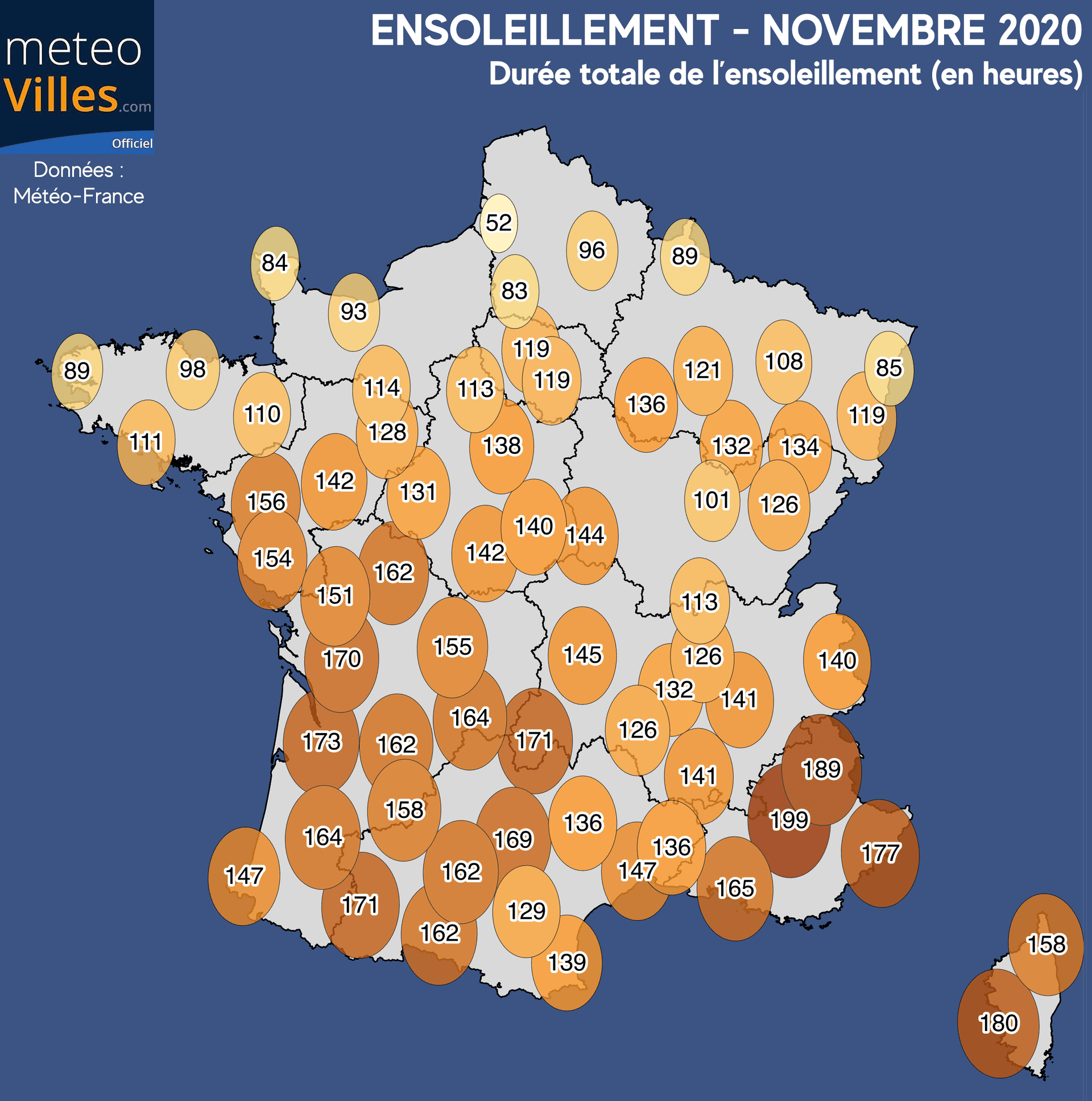 Avec de telles anomalies, de nombreuses villes ont donc battu leur record d’ensoleillement pour un mois de novembre : Bordeaux (173h), Auch (172h), Pau (170h), Poitiers (162h), Nantes (156h), Clermont-Ferrand (145h), Nevers (144h), Luxeuil (134h), Langres (132h), Le Mans (128h), Lyon (126h), Colmar (119h), Paris (118h) ou encore Charleville-Mezières (89h).