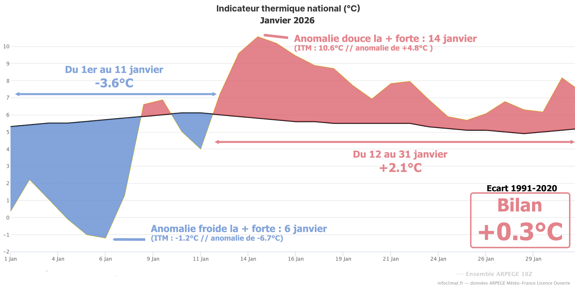 Avec un indicateur thermique national de 5.8°C, ce mois de janvier 2026 finit très légèrement au-dessus des moyennes de saison (+0.3°C). Une valeur bien éloignée des extrêmes observés en janvier 2018 (anomalie de +2.9°C) et surtout de janvier 1963, le plus froid observé en un siècle (anomalie de -6.9°C).