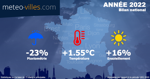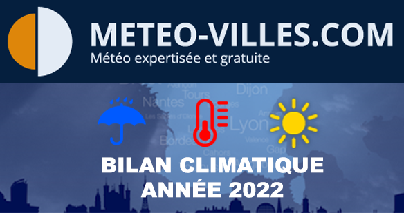 Toute l'équipe de Météo-Villes vous souhaite une très bonne année 2023 ! Et pour débuter cette nouvelle année, il est l'heure de faire les comptes de l'année écoulée. Place donc au bilan météorologique et climatique complet de cette ANNÉE 2022 en termes de température, pluviométrie et ensoleillement sur un panel de 73 stations*.