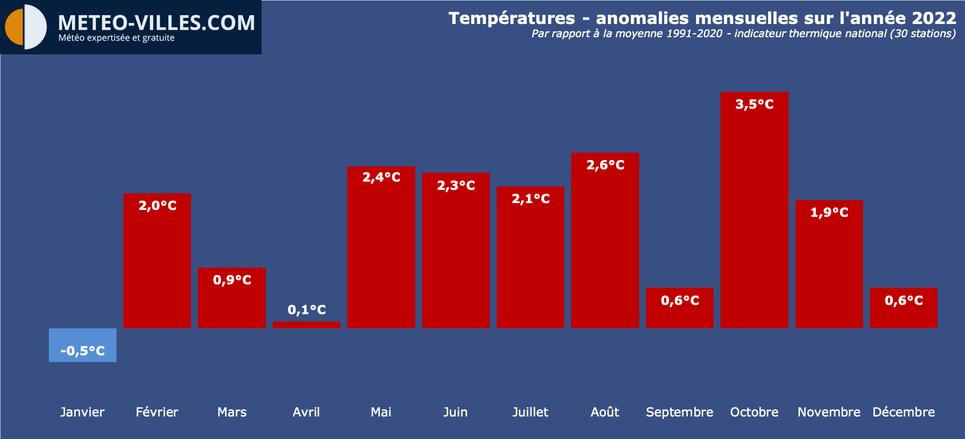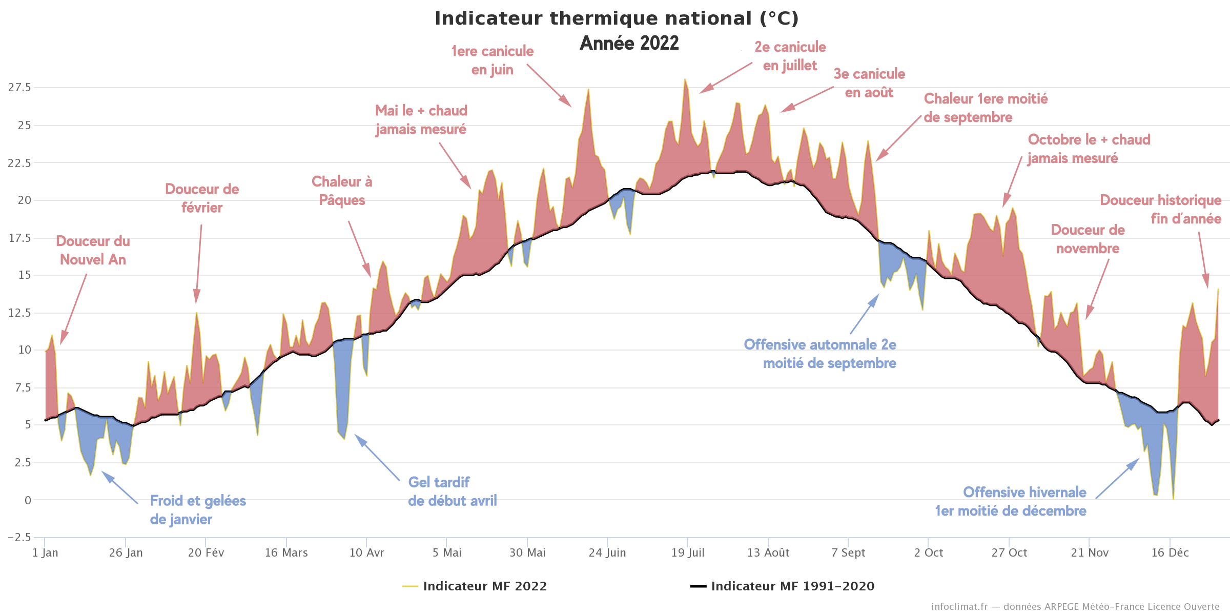 Indicateur thermique national (température moyenne) sur l'année 2022 et écarts à la moyenne 1991-2020 - Infoclimat