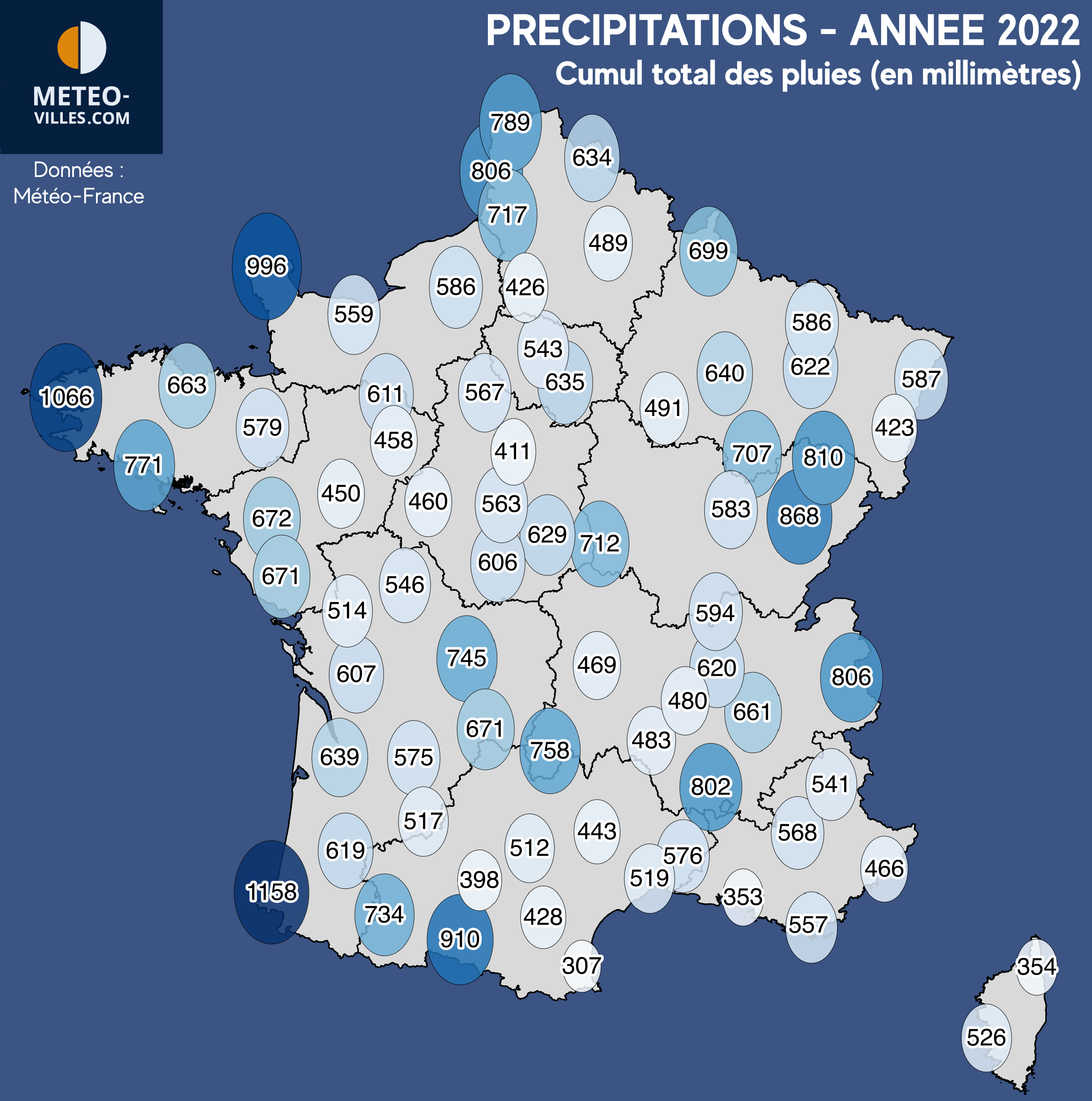Les Pyrénées, le Finistère, la Manche, le Pas-de-Calais, la Franche-Comté, le Nord des Alpes ou encore les Cévennes ont bénéficié de pluies plus fréquentes. Des secteurs plus arrosés ayant permis de dépasser les 800mm pour cette année 2022. Trois villes du panel ont approché ou dépassé la barre des 1000mm : 996mm à Cherbourg, 1066mm à Brest, et un maximum à mettre à l'actif de la ville de Biarritz (1158mm), secteur considéré climatologique comme l'un des plus arrosés de plaine en France.