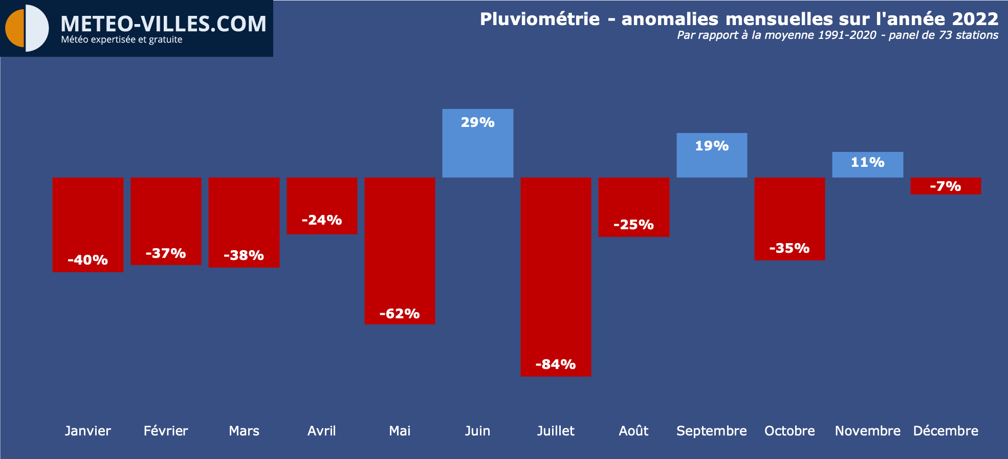 Si l'année a été historiquement chaude, la sécheresse a également fait parler d'elle à de nombreuses reprises en 2022. Le bilan est en effet peu réjouissant puisque largement déficitaire de -22% à l'échelle nationale sur notre panel de stations. Ceci s'est expliqué par une récurrence bien anomale de conditions anticycloniques sur notre pays, et l'absence de flux océaniques humides au cours de la période hivernale et printanière.