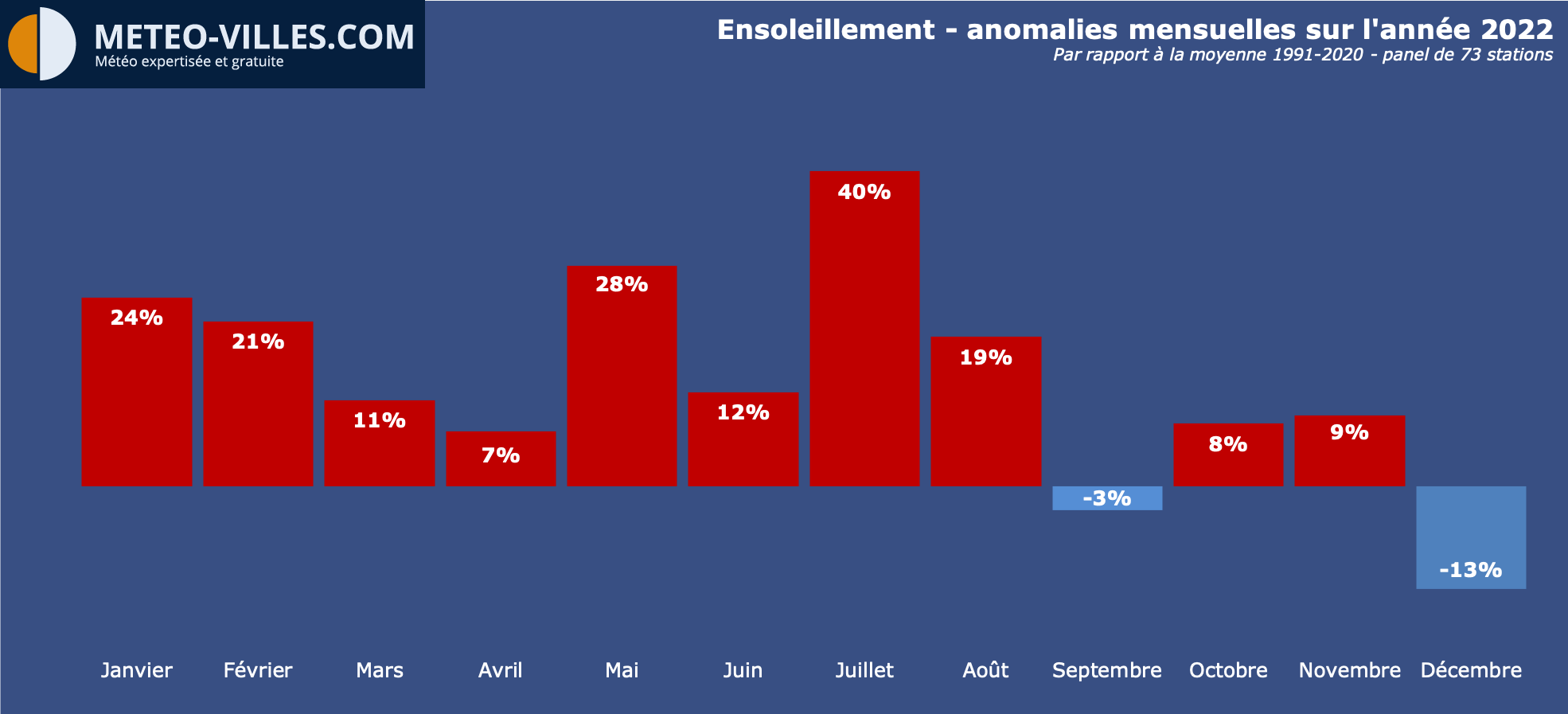 Les 8 premiers mois de l'année 2022 ont même été exceptionnellement ensoleillées (+21%) avec en point d'orgue un historique mois de juillet (+40%). Seuls les mois de septembre (-3%) et le tout récent mois de décembre (-13%) ont été plus gris que la moyenne.
