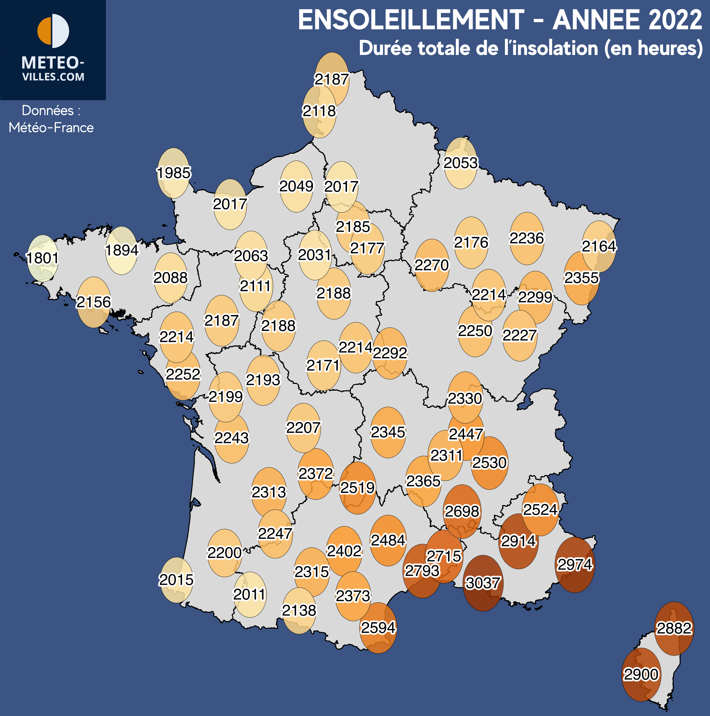 Hormis au pied des Pyrénées (2000 à 2100h), la moitié Sud reste toutefois plus ensoleillées encore. Comme à l'accoutumée, le quart Sud-Est et notamment les régions bordant la Méditerranée ont profité de l'ensoleillement le plus généreux avec 2700 à 3000 heures. Sur notre panel de stations, une seule est parvenue à dépasser les 3000 heures : il s'agit de Marseille-Marignane qui comme souvent (secteur le plus ensoleillé du pays) truste le podium avec 3037 heures.