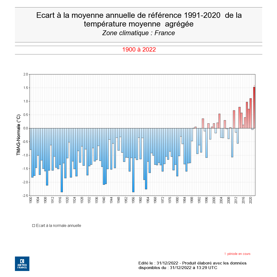 Anomalies annuelles de températures en France entre 1900 et 2022 - écarts à la moyenne de la période 1991-2020 - Météo-France / Etienne Kapikian