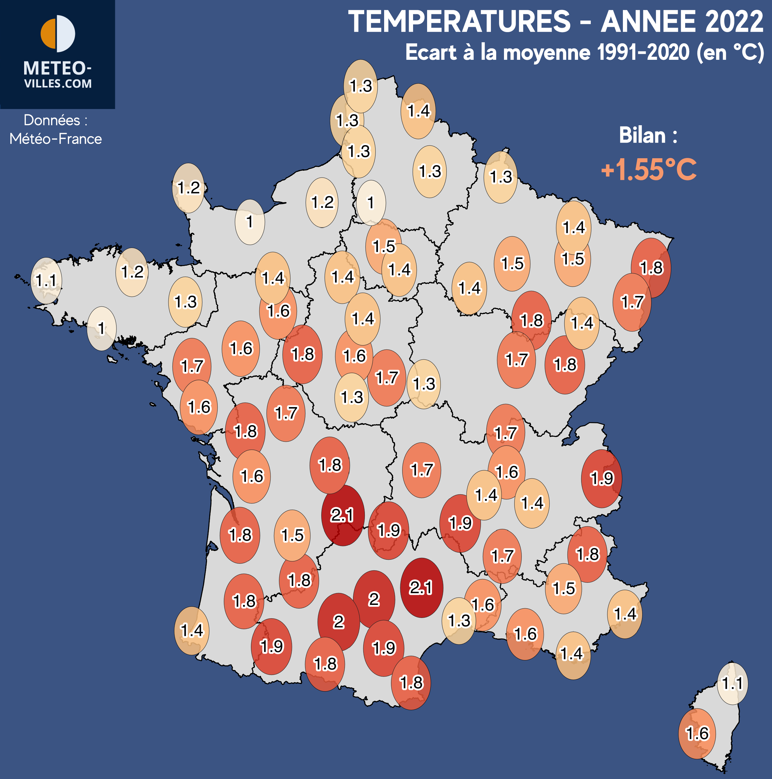 Avec un tel bilan, l'intégralité des villes de notre panel a bouclé cette année 2022 avec une anomalie supérieure ou égale à +1°C. Les anomalies les moins fortes se situent de la Bretagne aux Hauts-de-France (+1.0°C à Lorient, Caen ou encore Beauvais), ou plus localement sur la Corse (+1.0°C à Bastia).