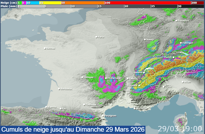 Cumuls de neige modélisés jusqu'au dimanche 29 mars 2026 - skipass.com