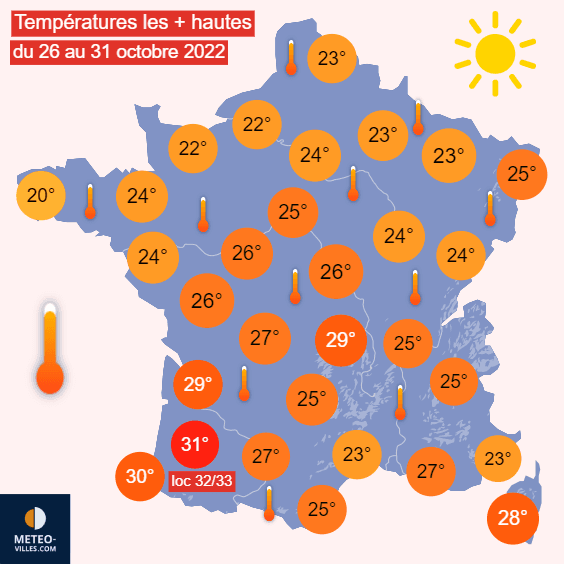 Une nouvelle hausse généralisée des températures interviendra ce mercredi 26 octobre 2022. Les 20°C seront atteints jusque dans le nord de la France et il fera 25 à 28°C dans le sud-ouest ! Un nouveau pic de chaleur est prévu le jeudi 27 avec 25 à 27°C dans le centre de la France et souvent 27 à 30°C au sud-ouest (localement 31-32°C en Aquitaine et au pied des Pyrénées). Des valeurs similaires sont prévues vendredi 28. Il pourrait même faire un à deux degrés de plus avec des valeurs proches de 30°C en plaine auvergnate ! La chaleur persisterait du sud-ouest au centre samedi 29, s'atténuant quelque peu dimanche 30 octobre.