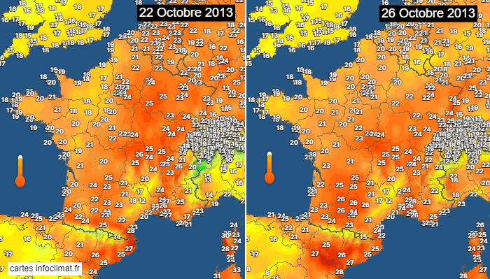 Températures maximales des 22 et 26 octobre 2013 – cartes infoclimat.fr