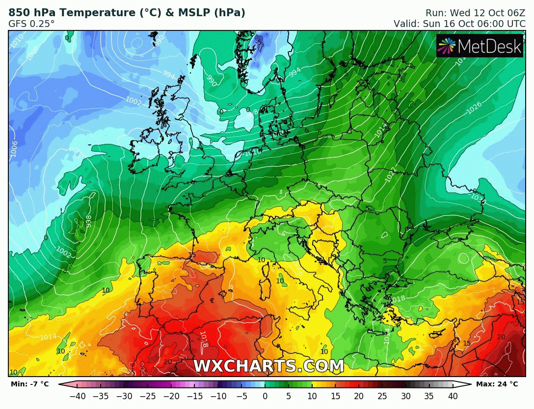 Masses d'air à 850 hPa (vers 1500m) du dimanche 16 au mercredi 19 octobre 2022 - via wxcharts.com