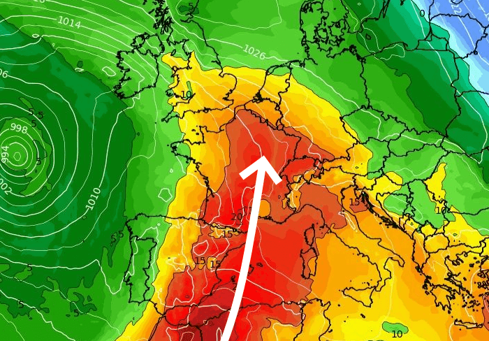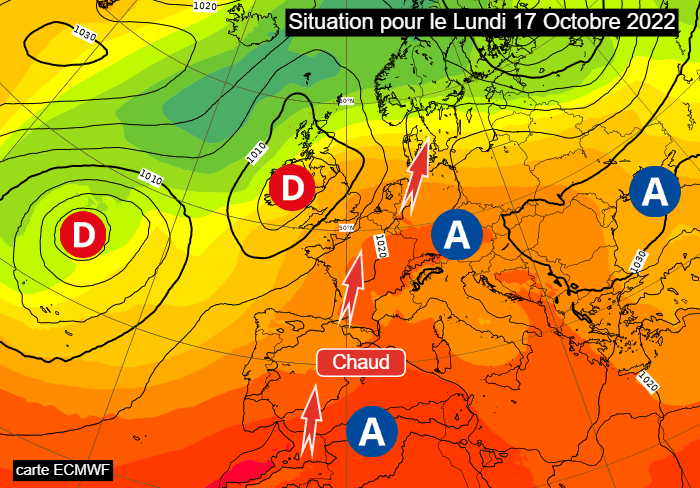 Ce week-end des samedi 15 et dimanche 16 octobre 2022, la configuration générale va évoluer. L'anticyclone migrera entre le bassin méditerranéen et l'Europe Centrale tandis que les dépressions vont se positionner entre le nord des Açores et les Îles Britanniques. Ainsi, c'est un flux de sud à sud-ouest assez dynamique qui se mettra en place sur la France. Comme les centres d'action devraient peu bouger en début de semaine prochaine, l'afflux d'air chaud venu du nord de l'Afrique sera important.
