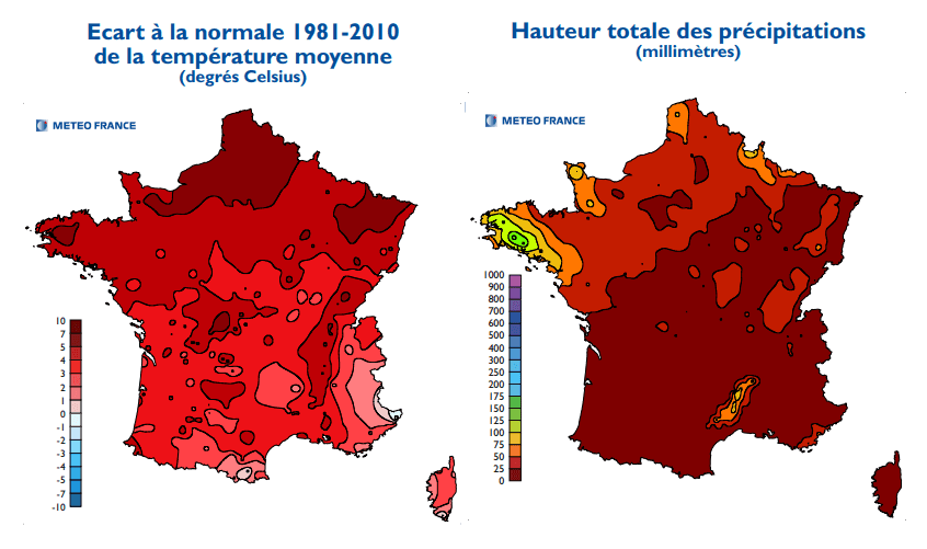 C'est toutefois la pluviométrie qui avait rendu l'hiver 2021-2022 marquant. Après un mois de décembre relativement humide, les hautes pressions se sont installées durablement durant les mois de janvier et février 2022. Sur ces deux mois, le déficit pluviométrique en France fut de l'ordre de 40% ! Certaines régions méditerranéennes n'avaient quasiment pas vu la pluie tomber ! Ce début d'année exceptionnellement sec avait posé les bases d'une sécheresse durable qui a rythmé la suite de l'année 2022.