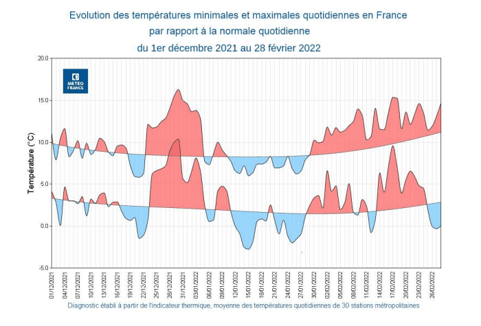Écart à la normale des températures minimales et maximales durant l'hiver 2021-2022 – via Météo France