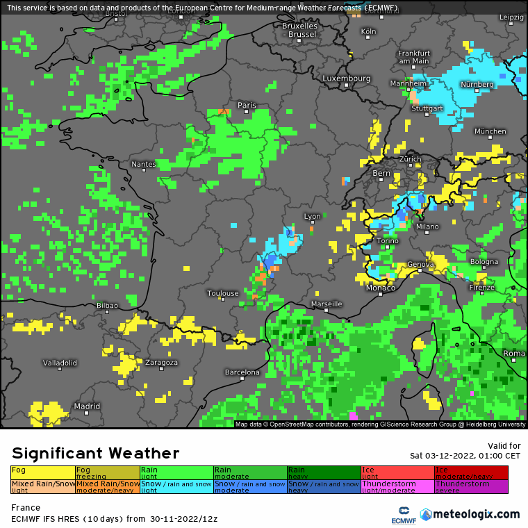 Précipitations les samedi 3 et dimanche 4 décembre 2022 selon le modèle européen - via meteologix.com