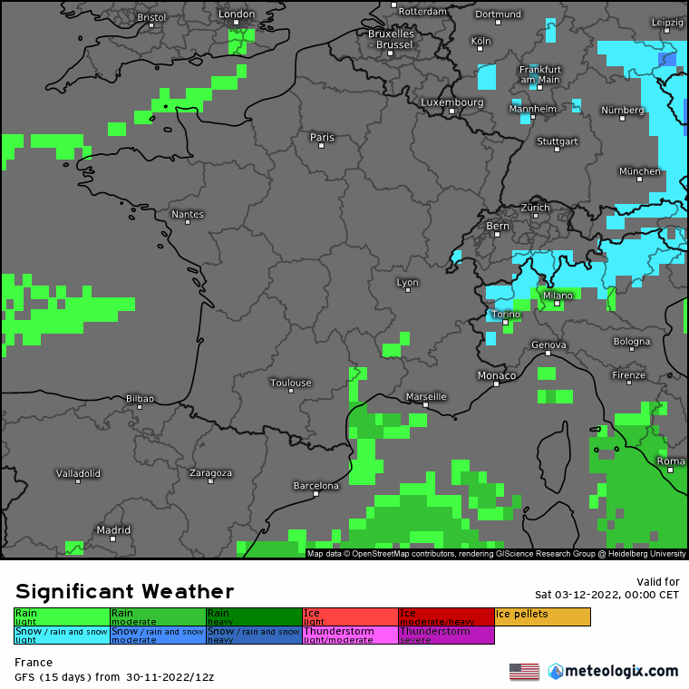 L'animation ci-dessous montre les précipitations envisagées par le modèle américain les samedi 3 et dimanche 4 décembre 2022 (en vert la pluie, en bleu la neige). On constate qu'il neigerait de manière soutenue sur le Massif Central (surtout samedi) mais aussi que ces précipitations remonteraient en direction des régions centrales (Auvergne, Centre, Bourgogne) puis de la Normandie où la pluie pourrait se mêler passagèrement de flocons en plaine, bien que les risques de voir les sols blanchir semblent faibles (précipitations faibles et froid pas assez marqué).