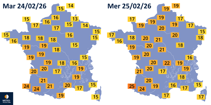 Températures maximales prévues les mardi 23 et mercredi 24 février 2026 - Météo Villes