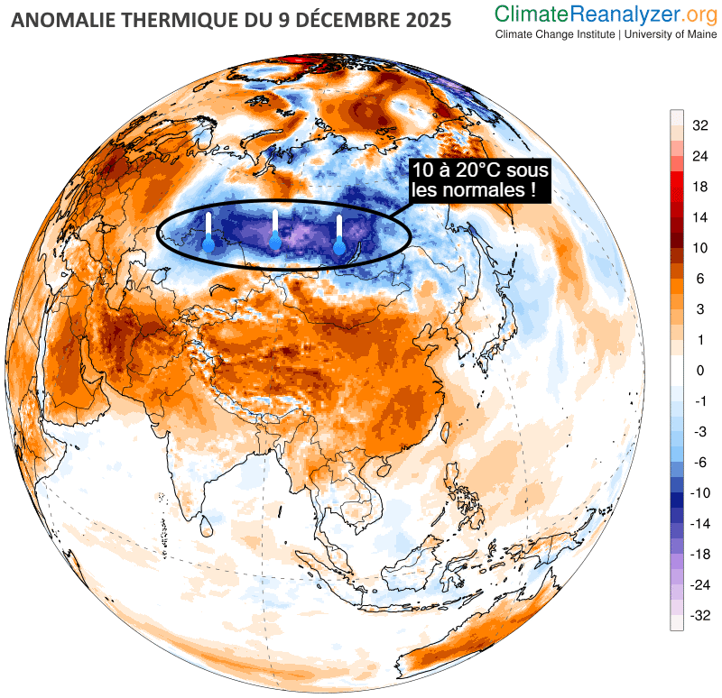 Pourtant, certaines régions de l'hémisphère nord enregistrent des anomalies opposées. C'est particulièrement le cas de la Sibérie en Russie. De vastes zones sibériennes connaissent depuis la fin novembre un froid particulièrement mordant. Actuellement, le thermomètre plonge à des niveaux 10 à 20°C inférieurs aux normales saisonnières en Sibérie centrale ! Ainsi, on a pu relever jusqu'à -54,3°C à Kerbo, valeur la plus basse en Russie depuis le début de la saison. On peut noter aussi les -51°C de Strelka-Chunya qui constituent la plus basse valeur mesurée en décembre depuis 23 ans !