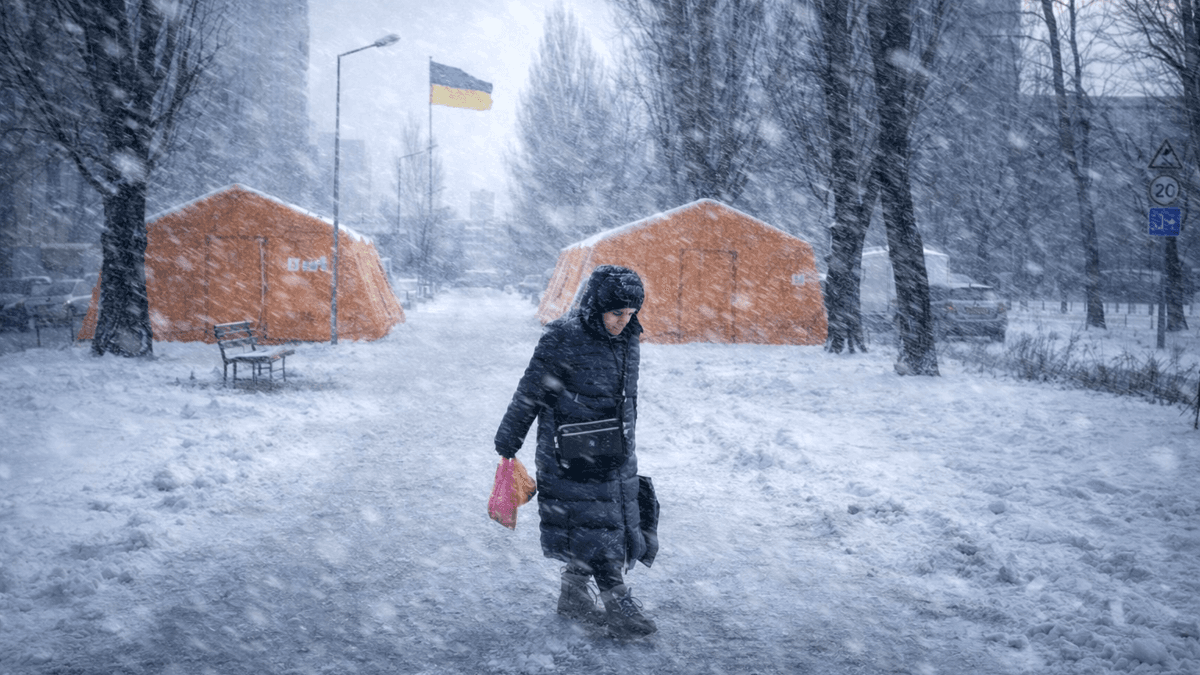 Alors que la guerre se poursuit, l'Ukraine fait face à un hiver très rigoureux. Le thermomètre chute jusqu'à -20°C à Kiev où les coupures d'électricité répétée empêchent les habitants de se chauffer et mettent la population à rude épreuve. Image améliorée par IA.