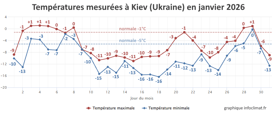 Températures minimales et maximales mesurées à Kiev (Ukraine) au mois de janvier 2026 - infoclimat.fr