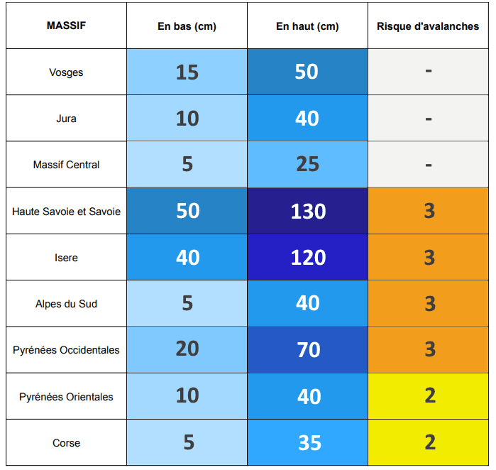 Enneigement moyen par massifs et risque d'avalanches au jeudi 27 novembre 2025 - Météo Villes