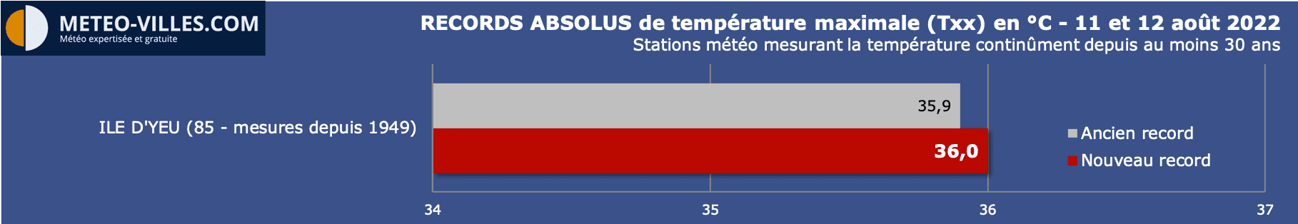 Sur l'Ile d'Yeu (Vendée), il a été mesuré 36.0°C lors des après-midi des 11 et 12 août. Il s'agit pour cette station d'un record absolu de chaleur, battant les 35.9°C ... de la précédente canicule (18 juillet) !