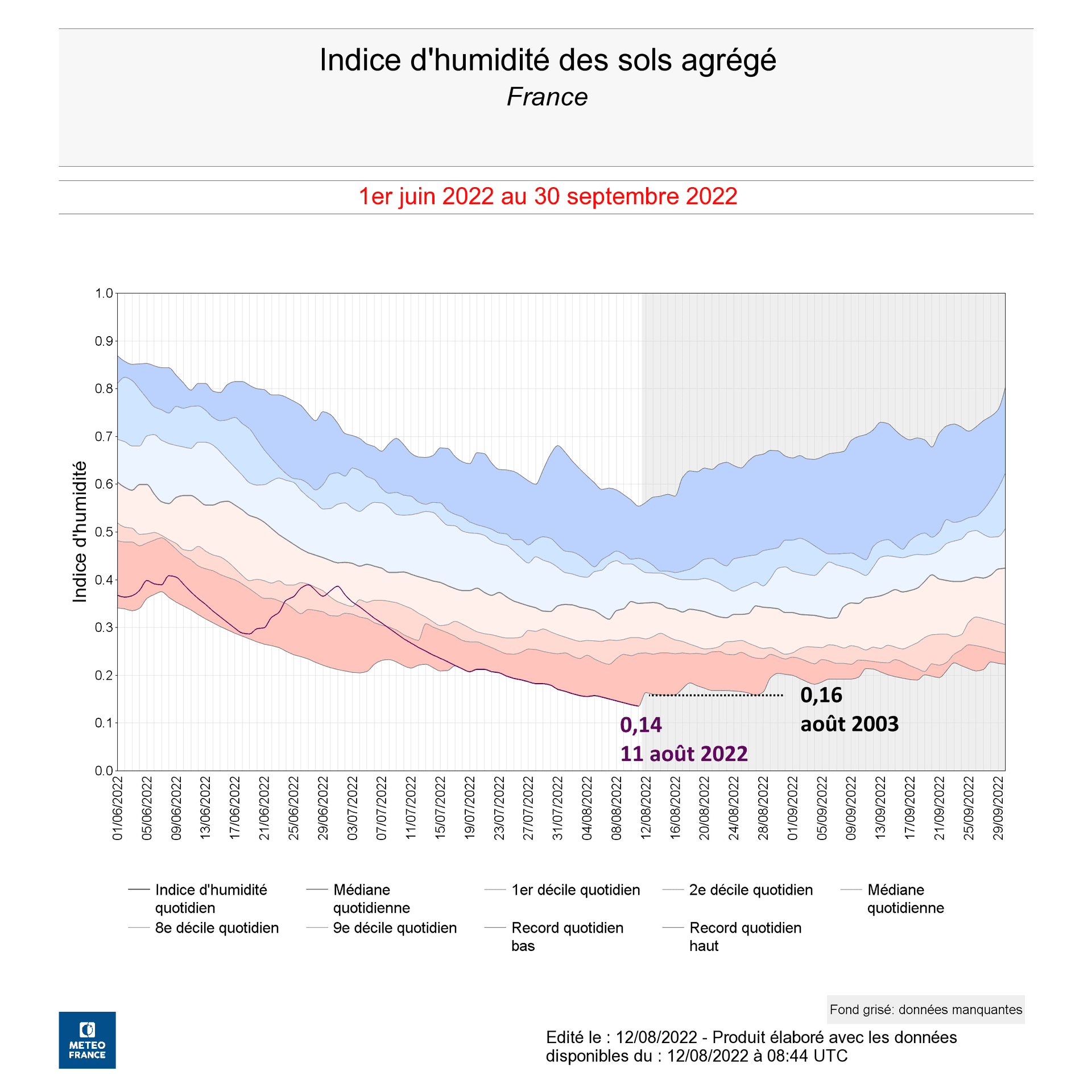 Bien évidemment, soleil et canicules récurrentes ne font pas bon ménage. Avec de telles conditions, la sécheresse s'est sensiblement aggravée lors de cette 3e canicule de l'été. Depuis la mi-juillet, l'indice d'humidité des sols atteint des niveaux exceptionnellement bas en France. Ce 11 août, cet indice a atteint 0.11, un record absolu dans le pays, dépassant le niveau de sécheresse du cœur de la canicule d'août 2003 (0.16).