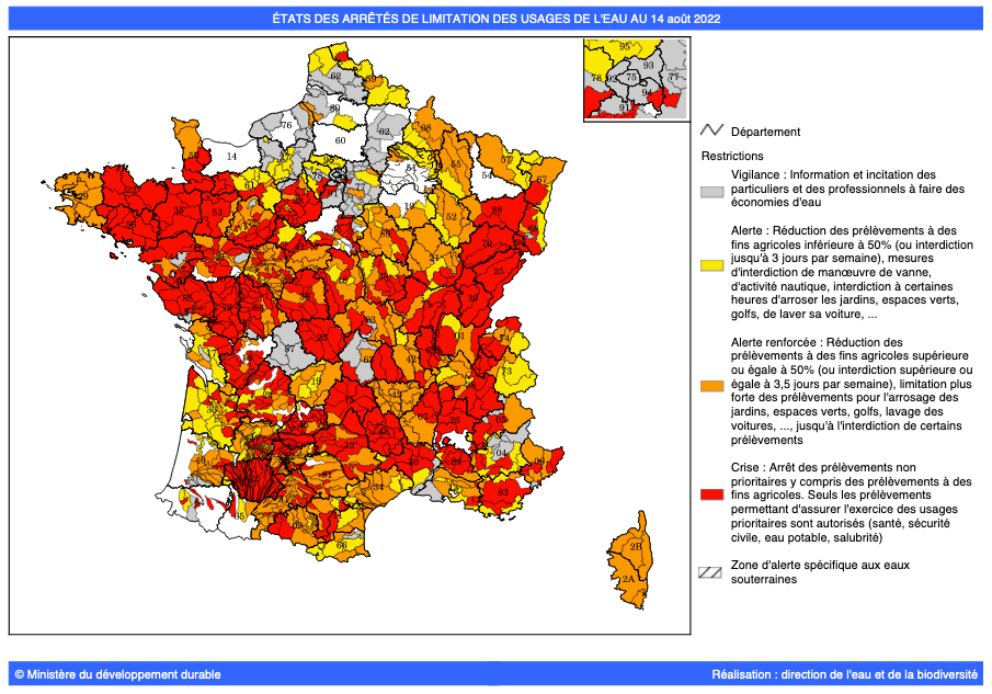 A l'issue de cette canicule (14 août), la quasi-totalité des départements du pays étaient concernés par des restrictions sur l'usage de l'eau, et pas moins de 71 départements sont en état de crise sécheresse, une situation historique, au delà de 2003 et de l'été 1976.