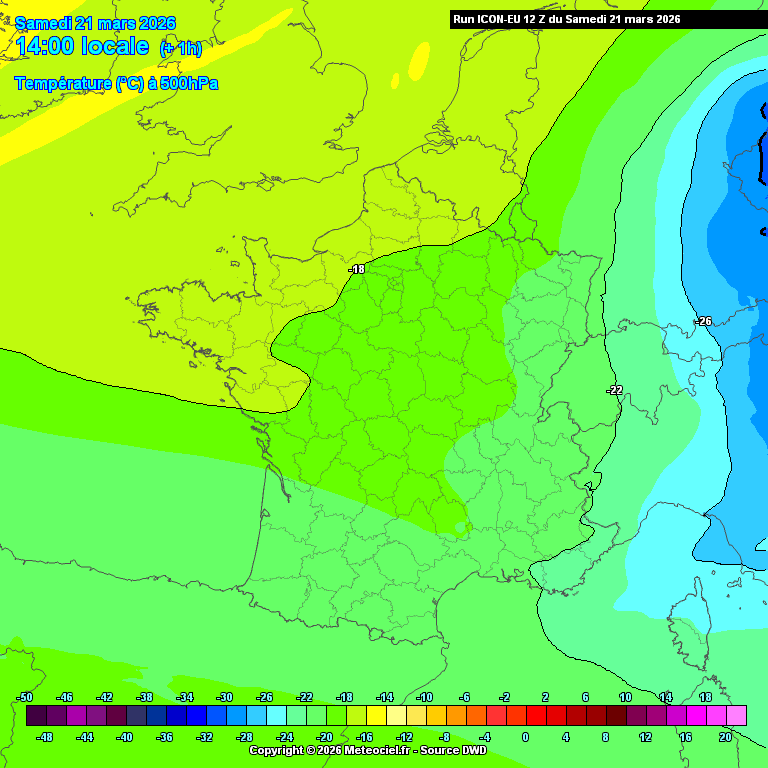 Animation des températures à 500 hPa sur l'ouest de l'Europe entre le 21 et le 23 mars 2026 – Modèle ICON-EU via meteociel.fr