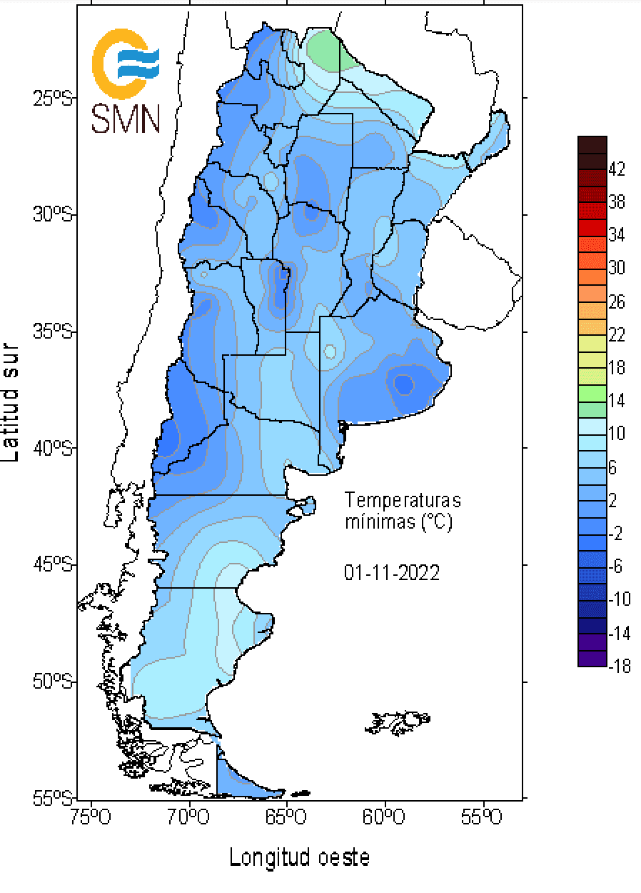 Températures minimales observées en Argentine - matinée du 1er novembre 2022 - SMN_Argentina