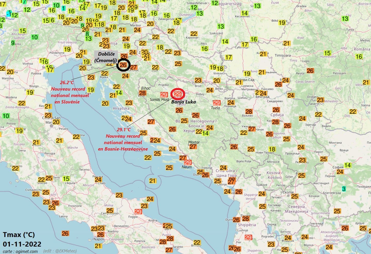 • En Bosnie-Herzegovine : 29.1°C Banja Luka contre un ancien record de 27.6°C Gradačac le 04/11/1996