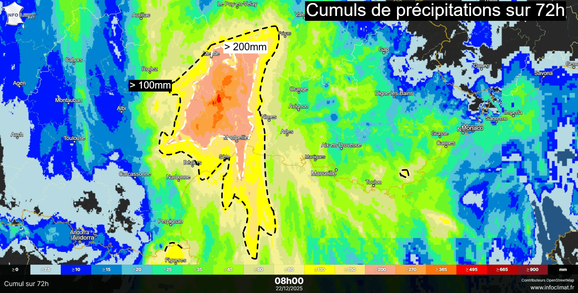 Cumuls de précipitations en 72h sur le sud de la France – Fond de carte : infoclimat.fr