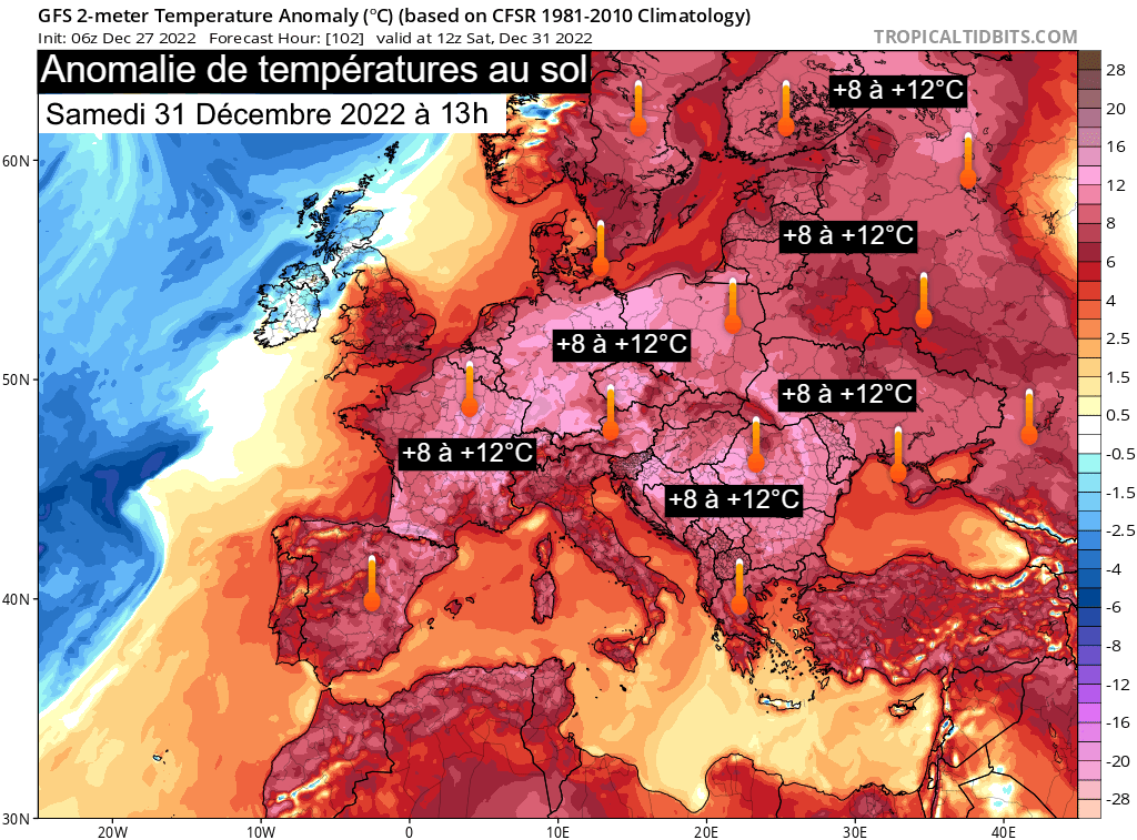 Comme un symbole, une nouvelle accentuation de la douceur va se produire au cours des derniers jours de l'année 2022 et pour le jour de l'An. Ci-dessous, les anomalies thermiques prévues au sol durant les journées du samedi 31 décembre 2022 et du dimanche 1er janvier 2023. En France, il est prévu des températures 8 à 12°C au dessus des normales ! Notons que ces anomalies majeures sont attendues sur une très grande partie de l'Europe (jusqu'à +14 à +16°C sur le centre du continent) qui pourrait bien vivre son jour de l'An le plus chaud jamais observé !