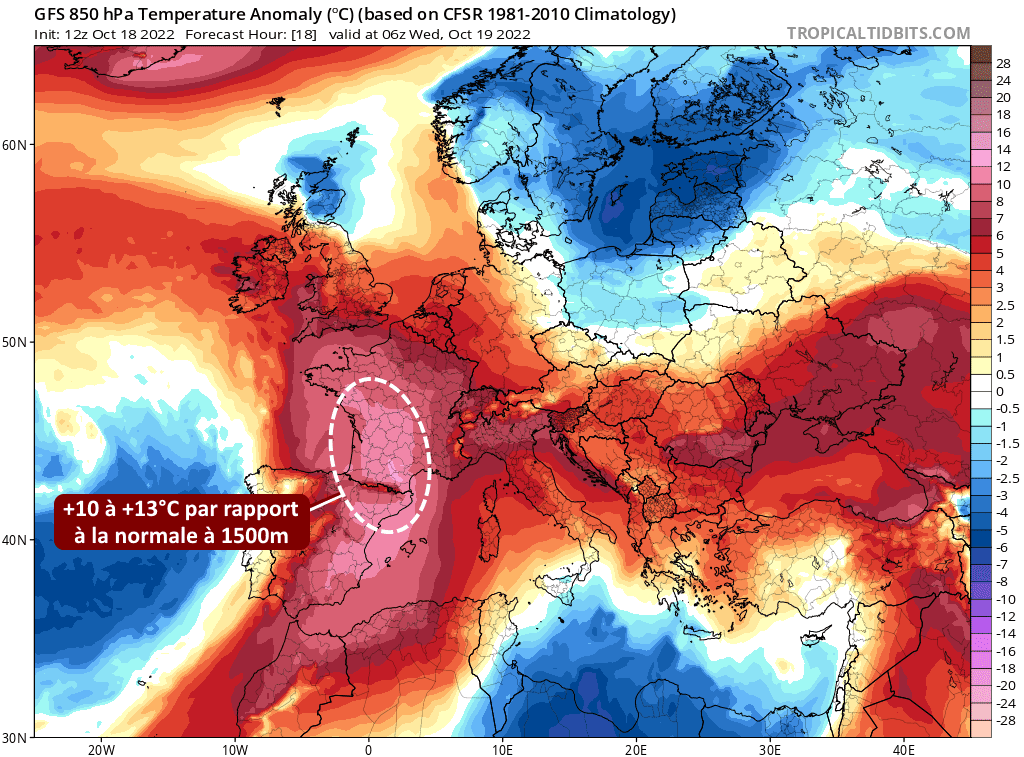 Sous ce flux de secteur sud prenant ses racines sur le nord de l’Afrique, une masse d'air remarquablement chaud pour la saison envahit la France. Dès ce mardi 18 octobre 2022, les températures de la masse d’air atteignaient 15 à 20°C vers 1500m d’altitude dans le sud-ouest du pays ! Ces niveaux concerneront les deux tiers de l'hexagone ce mercredi 19 octobre. Ces seuils sont habituellement observés durant les vagues de chaleur d’été et sont rarissimes si tard dans la saison !