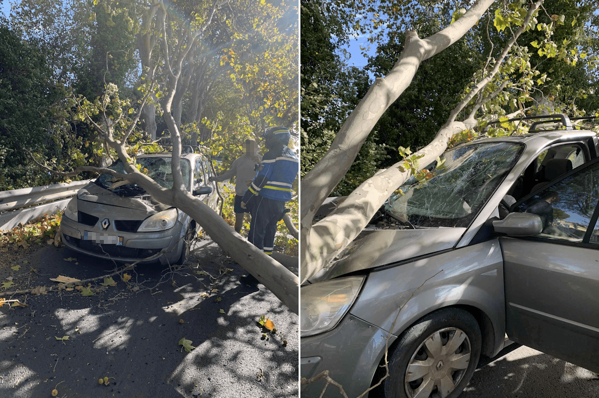 Chute d'arbre sur une voiture à Bessan (34) ce jeudi 23 octobre 2025 - photos Stéphane Pépin-Bonet