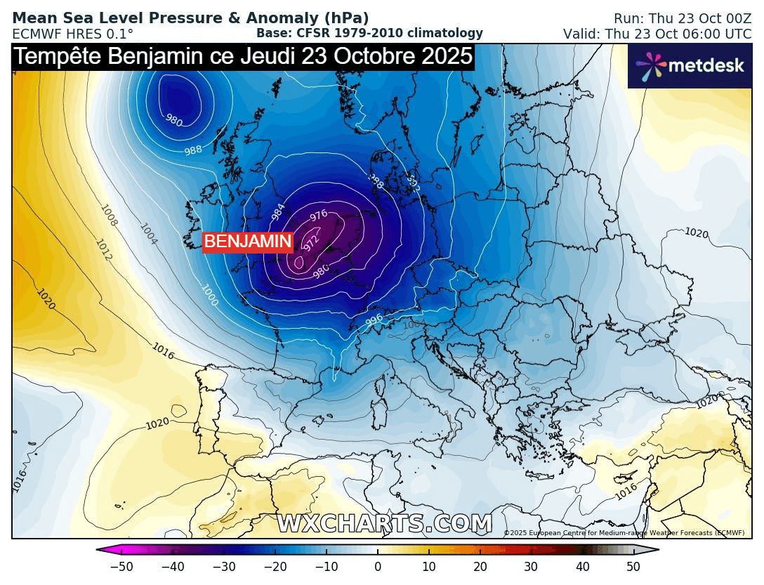 La tempête Benjamin s'est creusée au dessus de la Manche durant la nuit du mercredi 22 au jeudi 23 octobre 2025. Celle-ci a connu un renforcement rapide, bien que légèrement inférieur aux critères qualifiant une "bombe météorologique". C'est sur le sud de la Mer du Nord, vers l'extrême nord de la France et la côte belge, que les pressions ont atteint leur niveau le plus bas. En matinée du jeudi 23 octobre, Benjamin pointait à 972,4 hPa à Calais, une pression particulièrement basse, notamment pour un mois d'octobre.