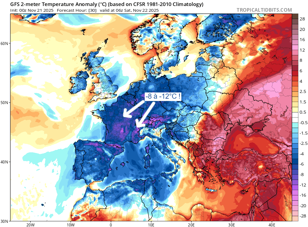 Anomalies de températures à 2m sur la France le samedi 22 novembre 2025 – Via TropicalTidBits